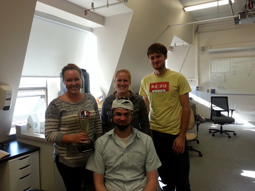 Keeping with tradition, the lab once again held a competition to see who could do the best job prepping a 64-channel EEG cap. Teams had 30 minutes from start to finish to show off their prep skills. Congratulations to the winning team of Monica, Laura, and Chris, and thanks to all those who volunteered their heads!