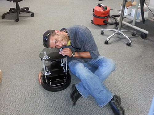 Lab collaborator Dr. Tim Bardouille gets up close and personal with a Turtlebot, the latest addition to the lab family. We’re using the Turtlebot in a brain-computer interface study looking at the use of EEG-based neurofeedback to modulate brain activity.