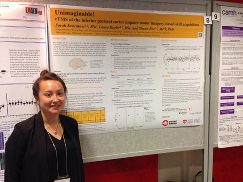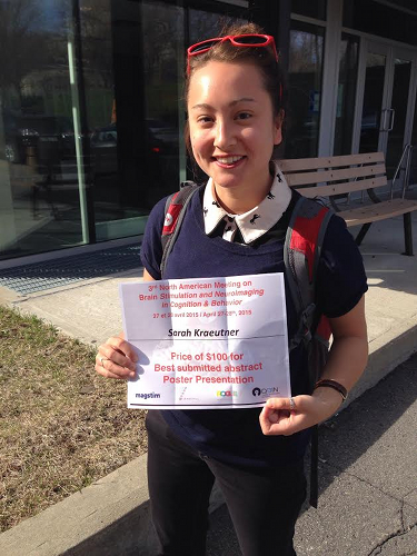 This month, lab members Shaun Boe, Sarah Kraeutner, Tony Ingram, and Monica MacDonald all attended the 3rd annual North American Meeting on Brain Stimulation and Neuroimaging in Cognition and Behaviour in Montreal, QC. Sarah presented her thesis work, and won the award for best poster! Congratulations Sarah!