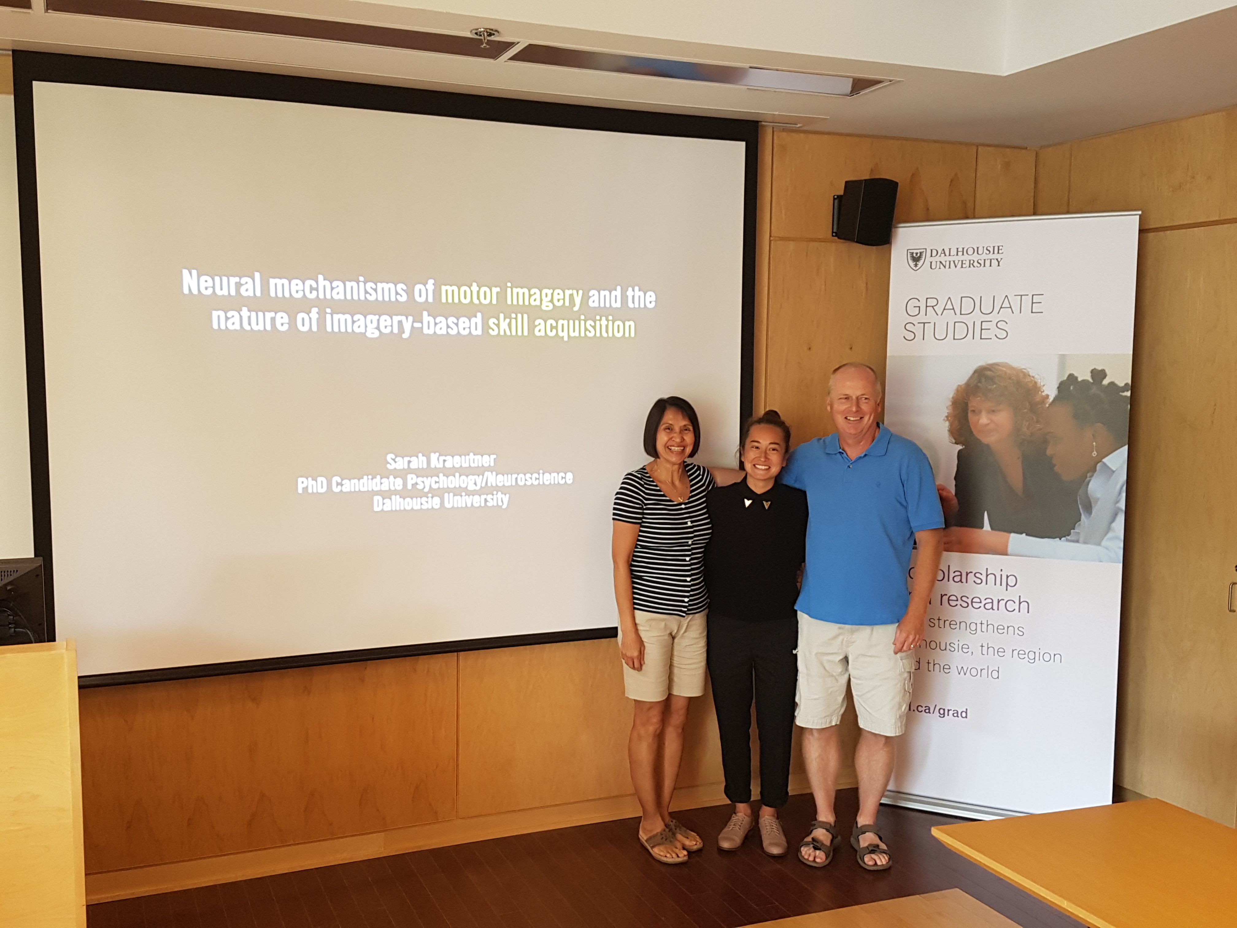 November 2020. It’s pretty exciting every time you publish a new paper, but especially so when the authors include not only your graduate students, but one of their parents! That’s right, Dr. Kraeutner (Sarah) and Dr. Kraeutner (Paul; both pictured below with Mom Jenny) are both authors on a recently accepted paper in the journal Scientific Reports, which examines how motor imagery practice can be leveraged when it is paired with physical practice. While Sarah led the study as part of her doctoral work, Papa Paul contributed to some specialized analysis that added greatly to the paper. It’s a family affair for the first time in the LBRF! Congrats to Sarah and Paul, and all the study authors.