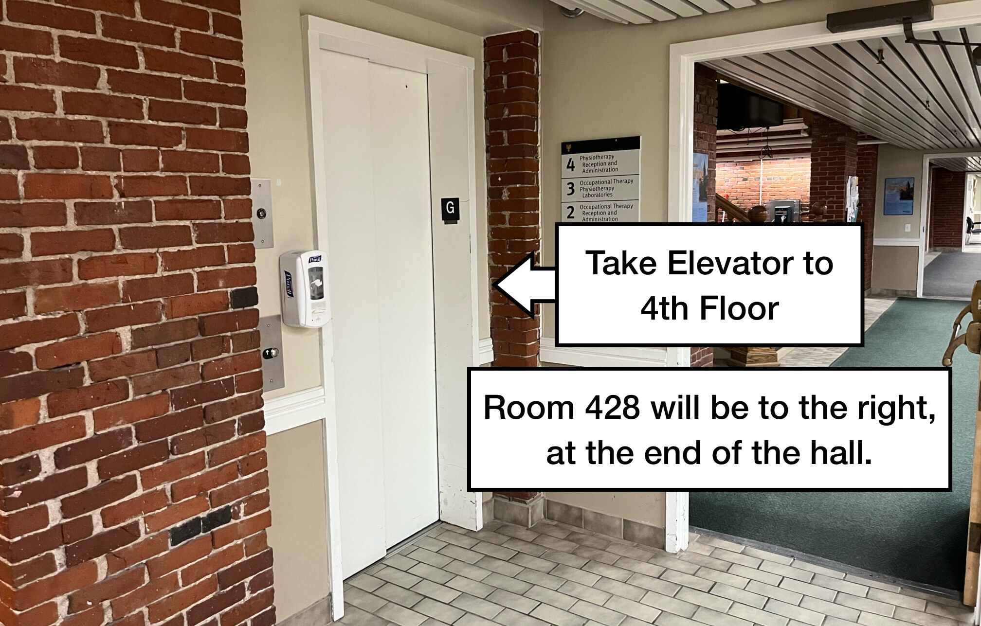 Soon, you should see an elevator to your right: take it to the 4th floor, and the lab will be at the end of the hall to your right!