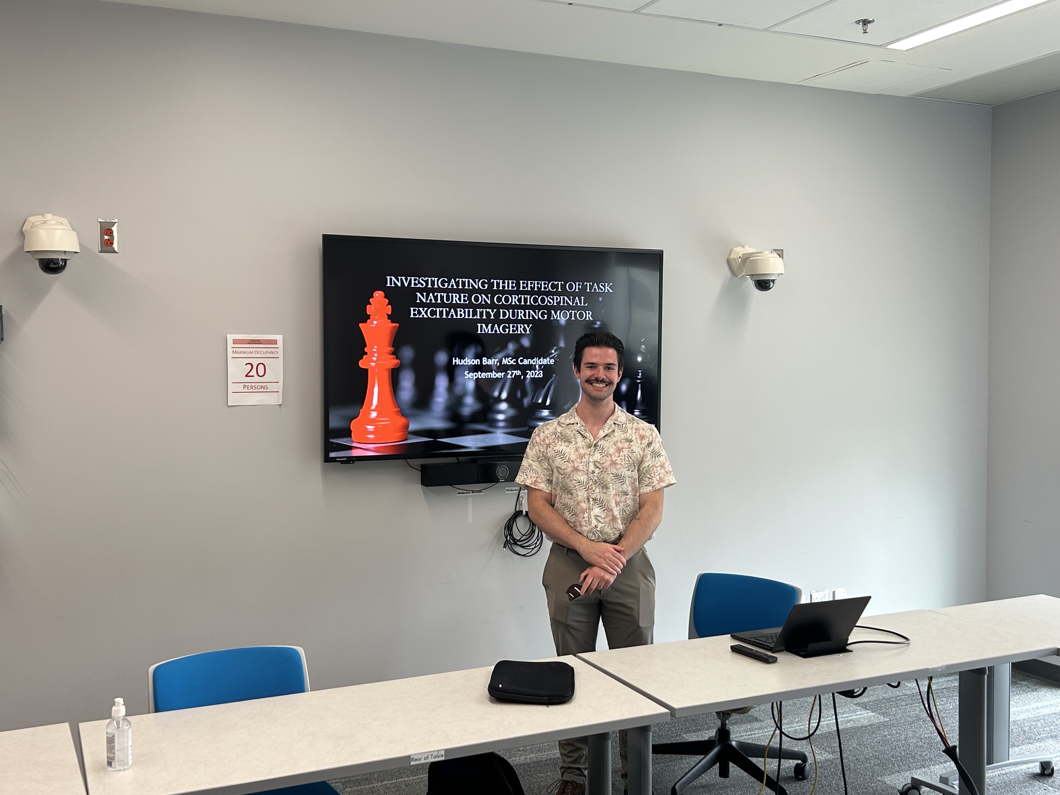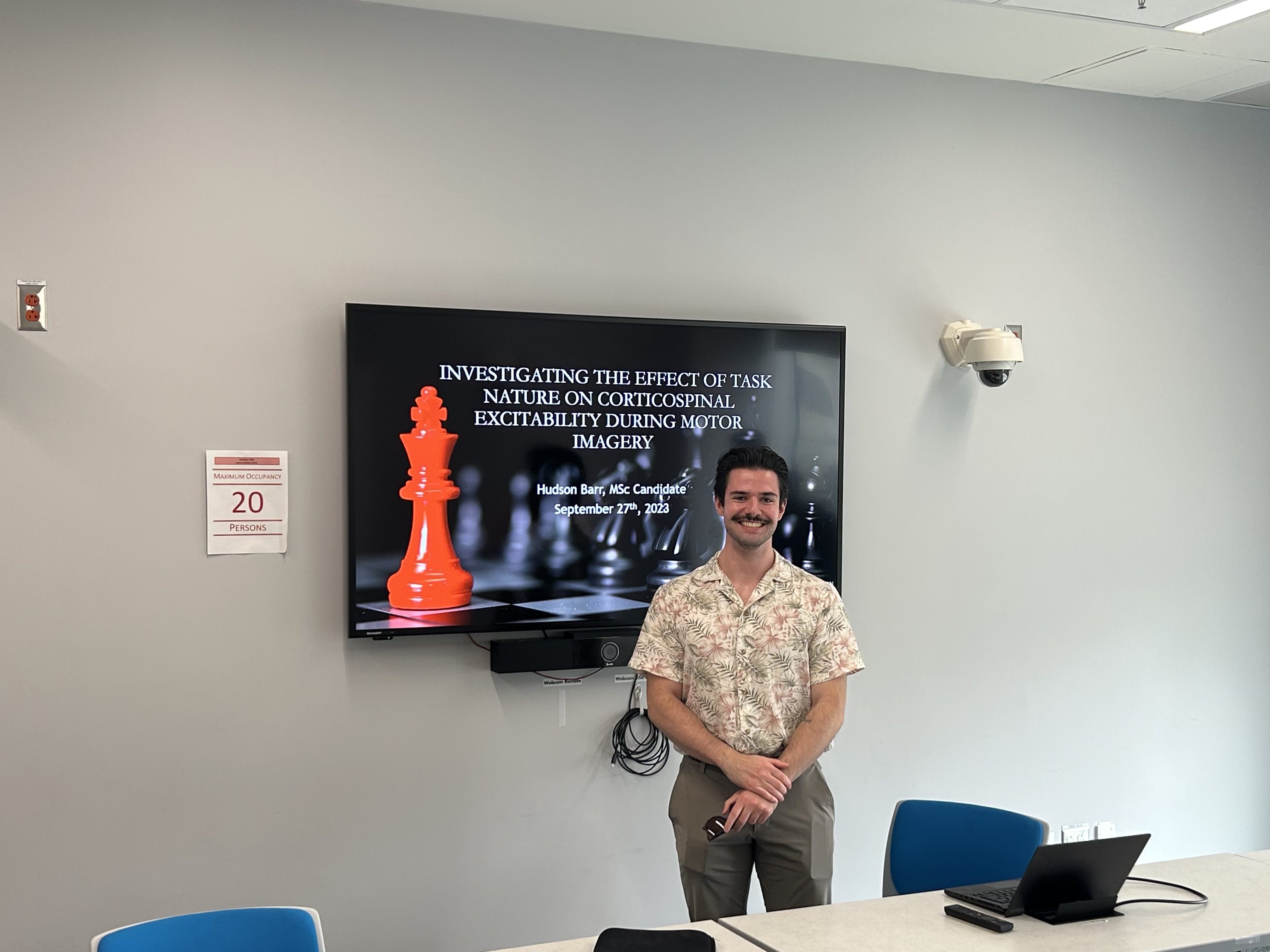 Congratulations to Hudson who defended his MSc work this past September. Hudson’s MSc looked at whether there was an effect of task type on brain excitability during motor imagery, with the goal of better understanding the nature of motor imagery. His work showed that more motor-based tasks resulted in high brain excitability.