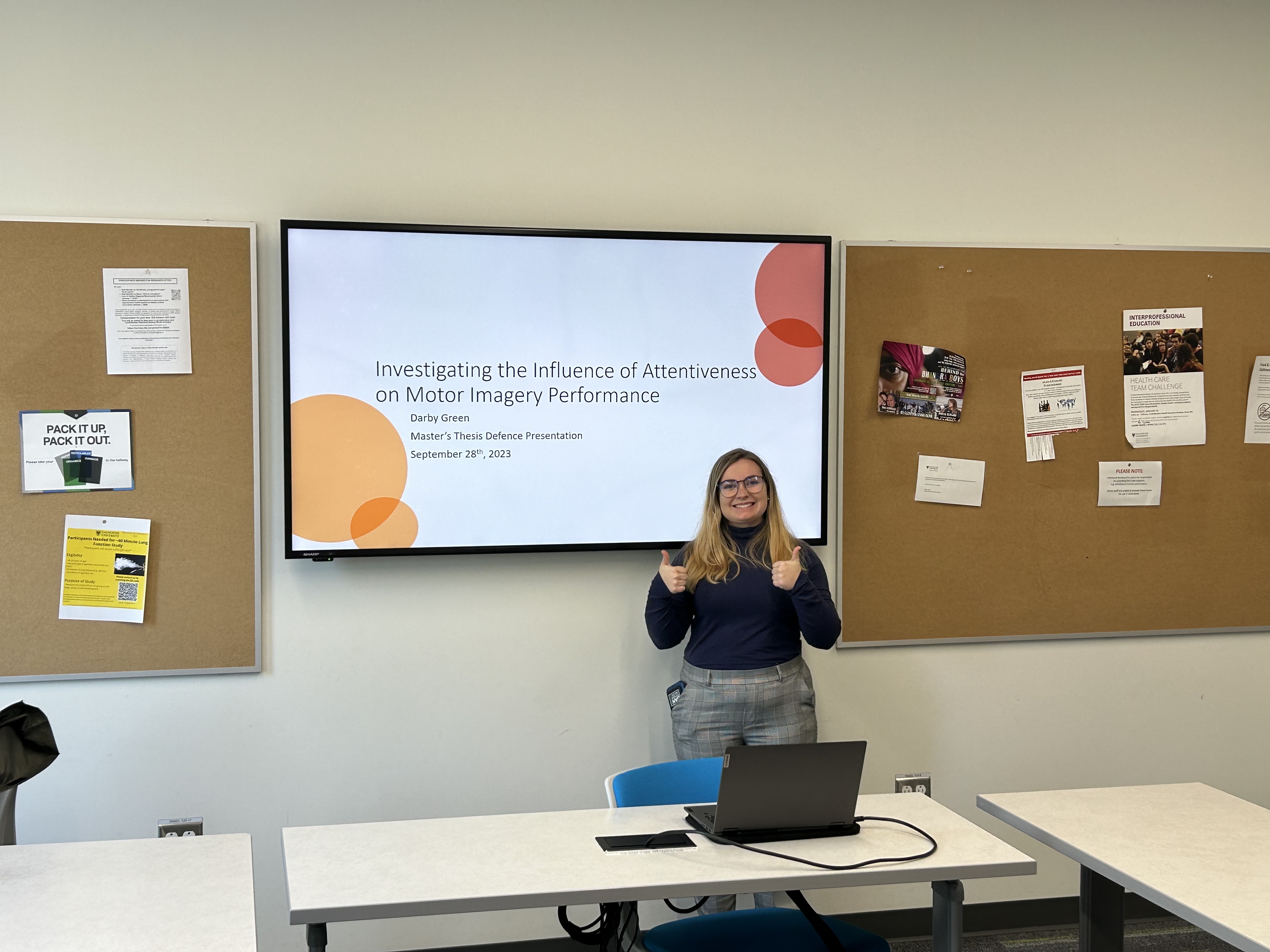Congratulations to Darby on the successful defense of her MSc thesis this past September. Darby’s work looked at whether a person’s level of attentiveness predicted their ability to do motor imagery. Results pointed to working memory as being an important predictor, and now the focus of some of our future work. Congrats Darby!