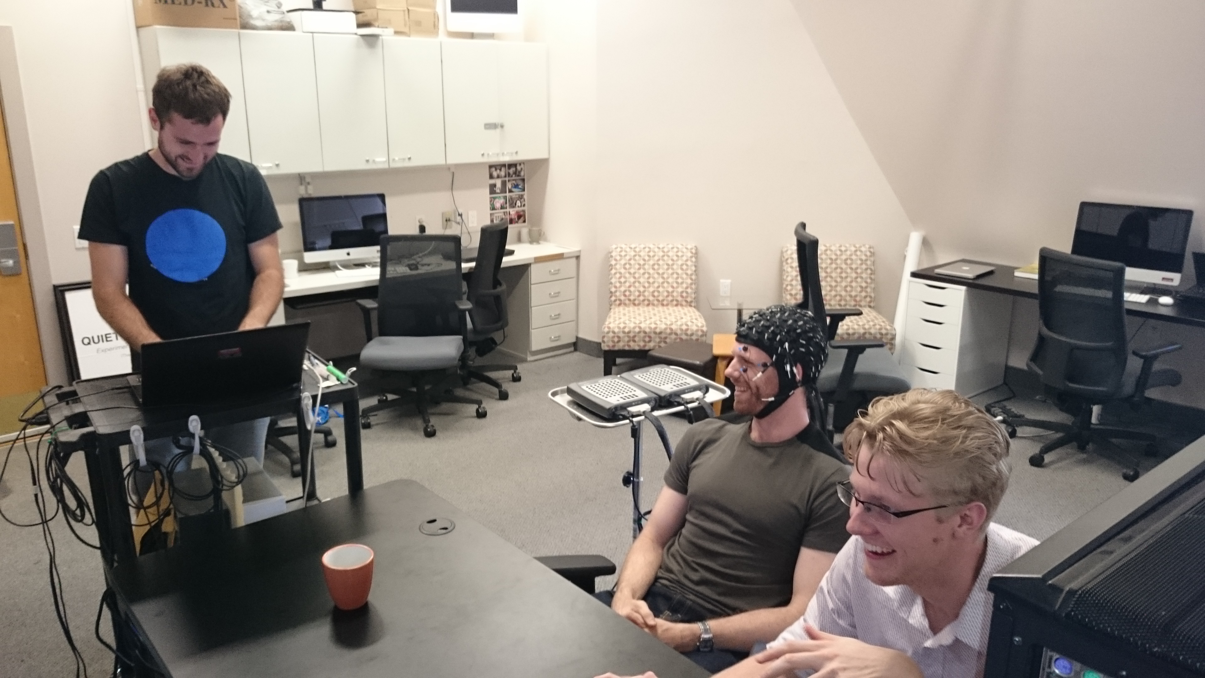 MSc student Chris Friesen working on his BCI project for imagined imitation with lab members Tony Ingram and Karl Simon. Chris’s project uses EEG to provide real-time neurofeedback to help with imagery performance.